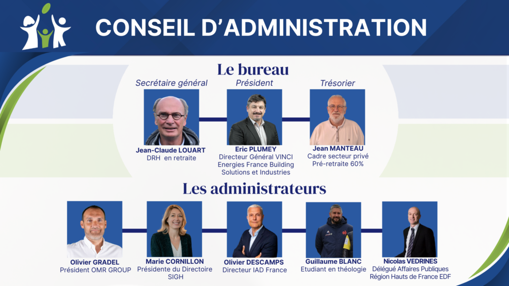 Son Président Eric Plumey occupe la fonction de directeur général chez Vinci Energies France Building Solutions et Industries. Nous pouvons compter sur Jean Manteau pour assurer la bonne gestion de la trésorerie de l’association, ainsi que sur Jean-Claude Louart, secrétaire général. Nous sommes également reconnaissants envers nos administrateurs : Olivier Gradel, président de la société OMR et secrétaire général de la Ligue de Rugby HDF, Guillaume Blanc, étudiant en théologie, Olivier Descamps, directeur chez IAD France, Nicolas Vedrines, délégué en Affaires Publiques chez EDF et enfin Marie Cornillon, présidente du directoire SIGH.