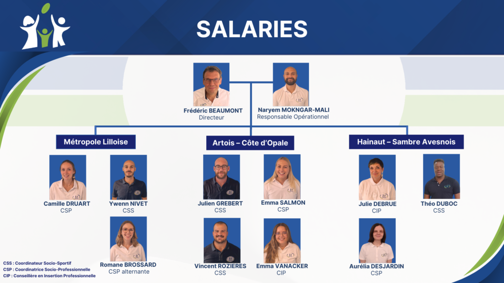 En plus du directeur opérationnel, Frédéric Beaumont, et du responsable opérationnel Naryem Mokngar-Mali, nous pouvons compter sur quatre coordinateurs socio-sportifs, répartis sur plusieurs secteurs. Pour le volet professionnel, l’association compte dans ses rangs actuellement deux conseillères en insertion professionnelle, et trois coordinatrices socio-professionnelles.